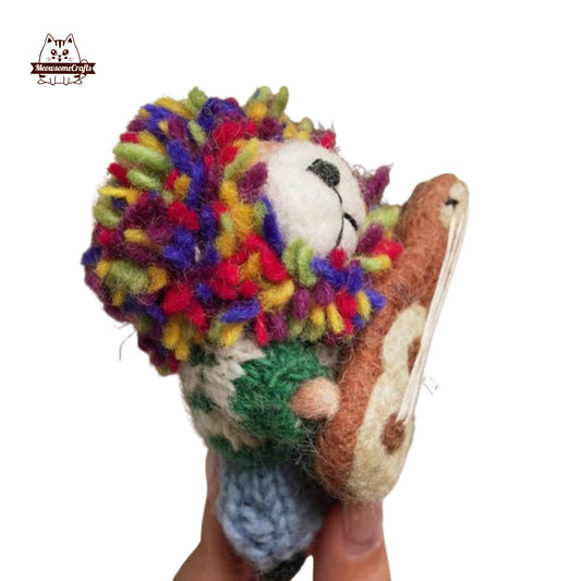 Handmade Needle Felted Colorful Mane Lion Playing Guitar Keychain | Finished Felted Lion
