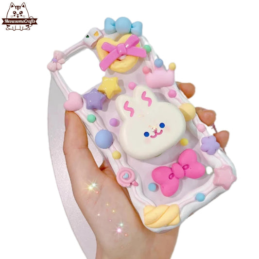 Finished Handmade Decoden Phone Case | Kawaii Rabbit Ice Cream Sandwich Candy Hearts Charms | Samsung Android iPhone Cases