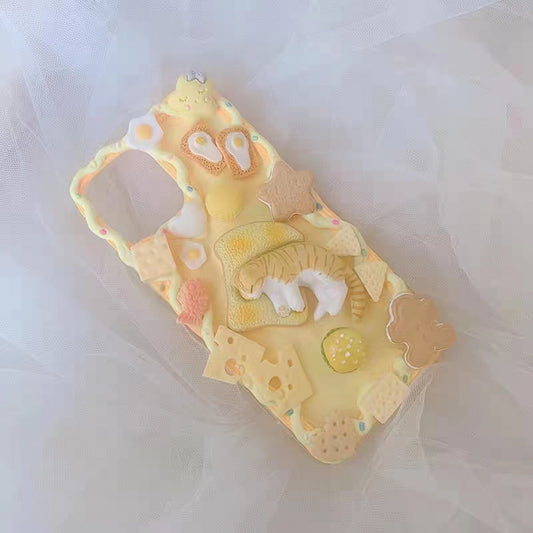 Finished Handmade Decoden Phone Cases | Cat Sleeping On Toast Cookies Crackers Food Charms | Samsung Android iPhone Cases